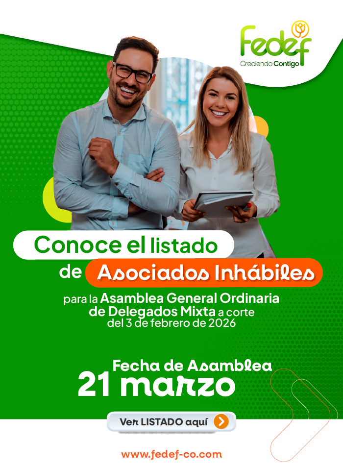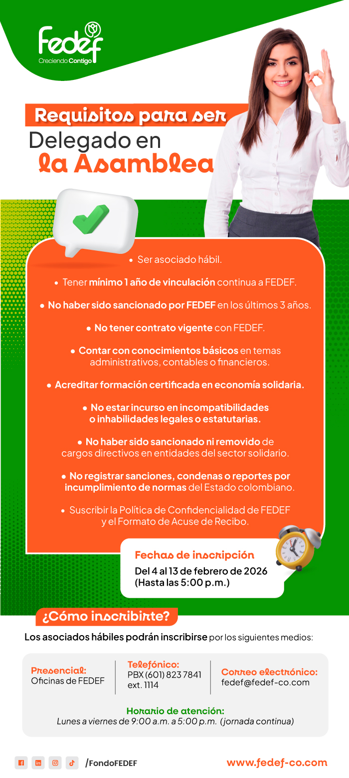 Asamblea General de Delegados 2026 La asamblea es el máximo órgano de dirección de PRESENTE, el cual es constituido por los asociados hábiles o Delegados elegidos y convocados. De ella emanan sus poderes y los de los demás organismos. Conoce a Nuestros Delegados Elegidos Comunicados Asamblea Informe de Gestión 2025 Aviso Convocatoria - 29 Diciembre 2025 Aviso Convocatoria - 06 Enero 2026 Aviso Habilidad e Inhabilidad de Asociados Aviso Convocatoria - 13 Enero 2026 Aviso 2 de Habilidad e Inhabilidad - 15 Enero 2026 Aviso 3 de Habilidad e Inhabilidad - 22 Enero 2026 Convocatoria Asamblea General Ordinaria Mixta Reglamento de Elección de Delegados Cronograma Asamblea General Ordinaria de Delegados Proyecto Reforma Estatuto 2026 Certificado de Habilidad Tarjeton Delegados 2026 Código de Ética y Buen Gobierno Acta Elección Delegados 2026 - 2028 Reporte Electoral Detallado